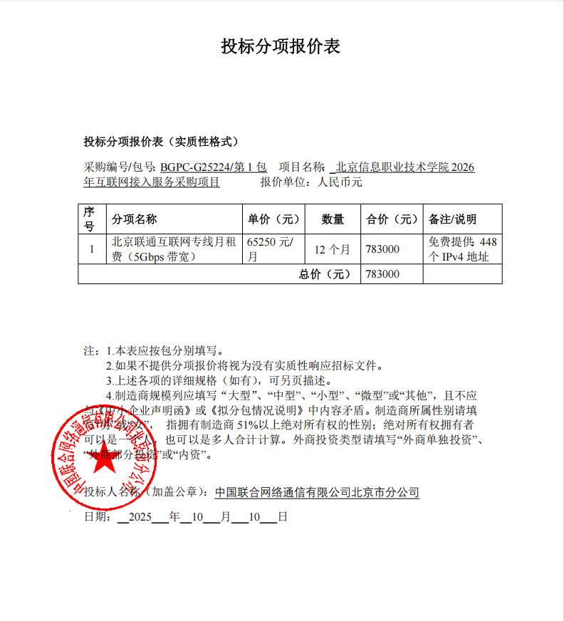 中国联合网络通信有限公司北京市分公司 | 1 | 78.3万元 | 78.3万元 | 详见采购文件 |